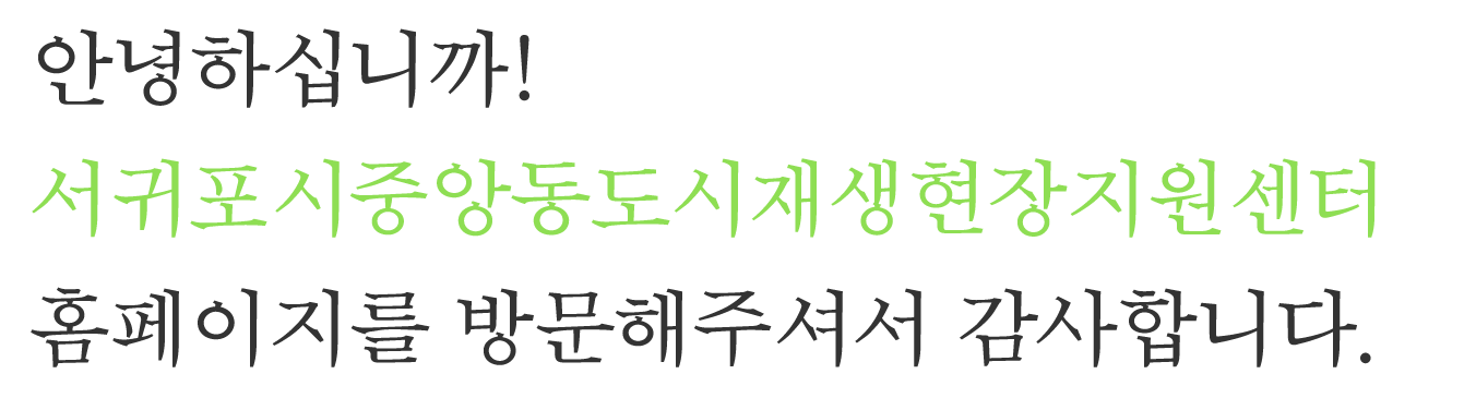서귀포시 중앙동 도시재생현장지원센터는 ‘중앙동네 예·체·능’을 비전으로 삼아, 원도심의 활력 회복과 주민 주도의 지속 가능한 도시재생을 실현하기 위해 설립되었습니다.