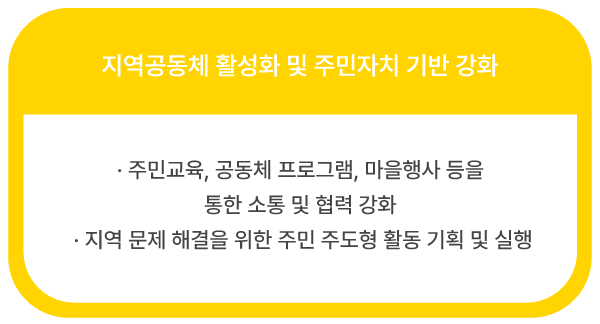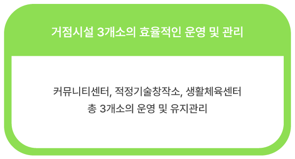 거점시설 3개소와 자원을 운영‧관리하고, 지속 가능한 지역 공동체 기반을 조성하기 위해 설립된 비영리 단체의 사회적협동조합입니다.