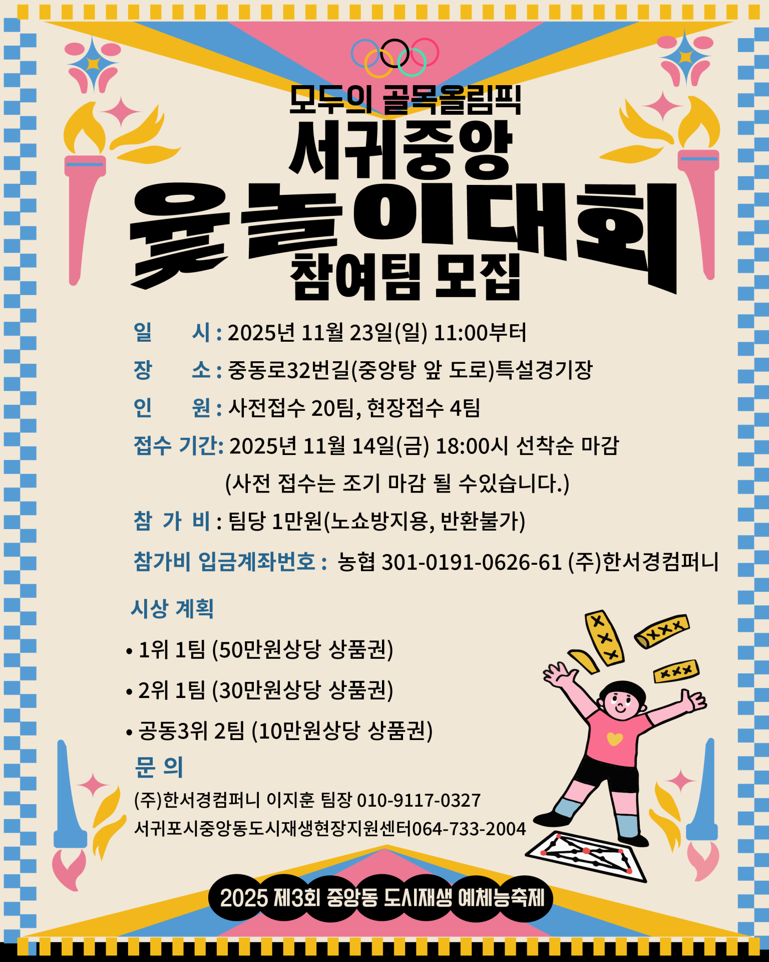 🎲 “이기면 50만원, 지더라도 웃음은 100점!”친구, 가족, 이웃과 함께‘모두의 골목올림픽 – 서귀중앙 윷놀이대회’참가팀 모집!!윷 던지고, 웃고, 소리 지르자!🏆 우승팀엔 최대 50만원 상품권이 기다리고 있어요.👉 참가신청은 아래 링크에서!https://naver.me/50J8ltXk